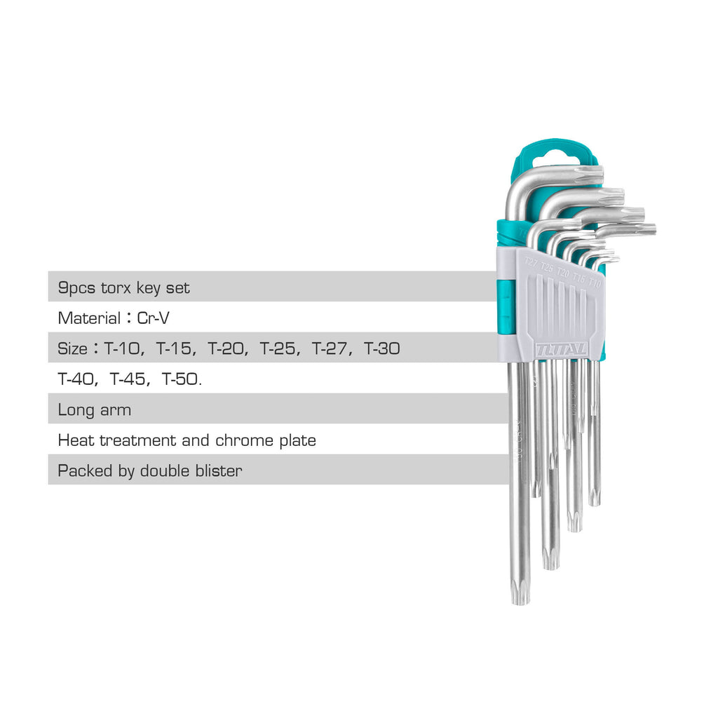 Ključi imajo dolge ročaje, kar povečuje njihovo funkcionalnost in olajšuje delo na težko dostopnih mestih. Velikosti ključev segajo od T10 do T50.