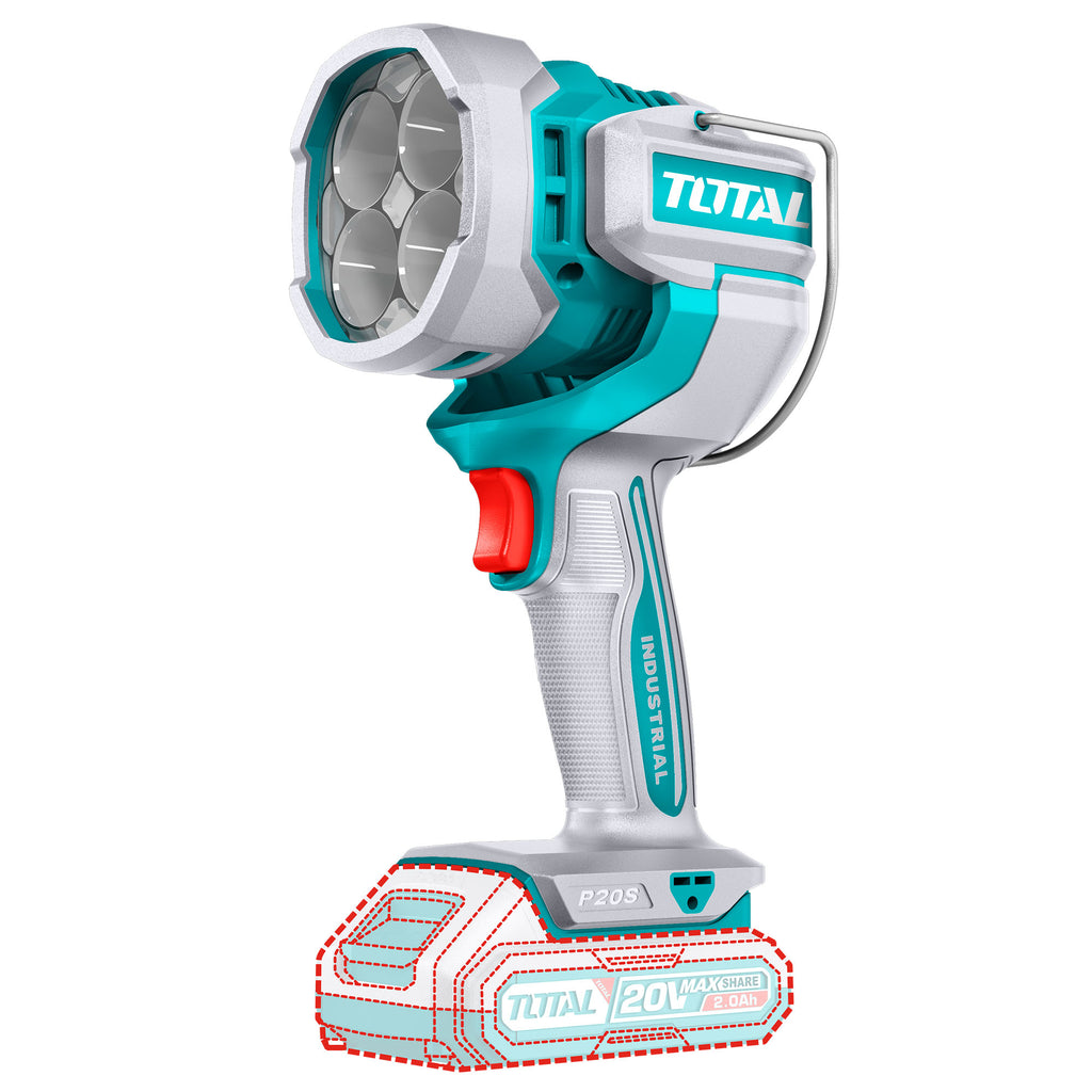 Napetost: 20V Poraba moči LED: 22,5W Lumni: Visoko: 2000±10% Srednje: 1400±10% Nizko: 800±10% 3 načini svetlosti Kovinski obešalnik Ergonomski ročaj z mehkim oprijemom Izjemno dolga razdalja osvetlitve Glava LED svetilke se lahko zavrti za 130° stopinj Baterija in polnilec se prodajata ločeno Pakirano v barvni škatli
