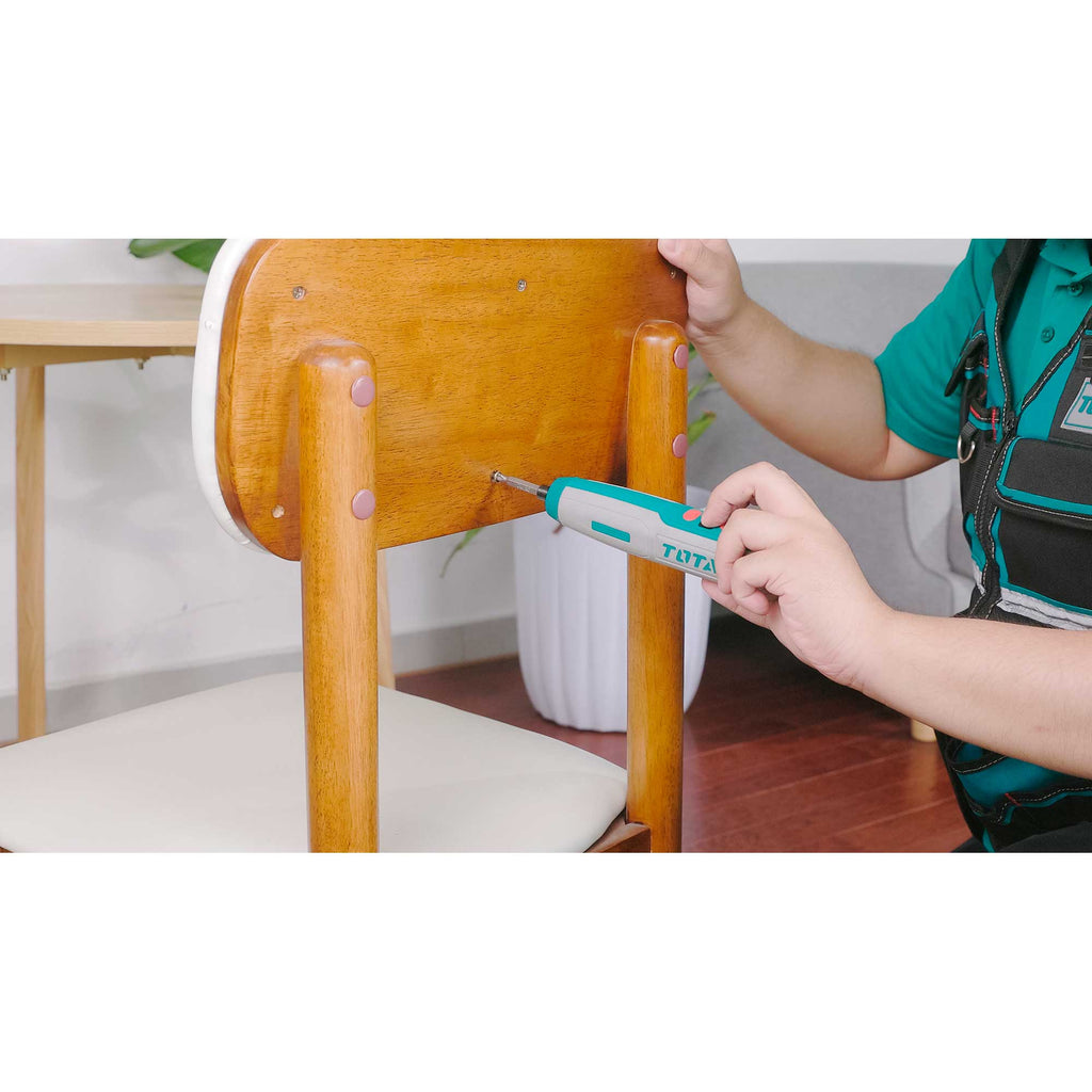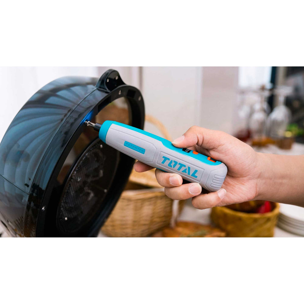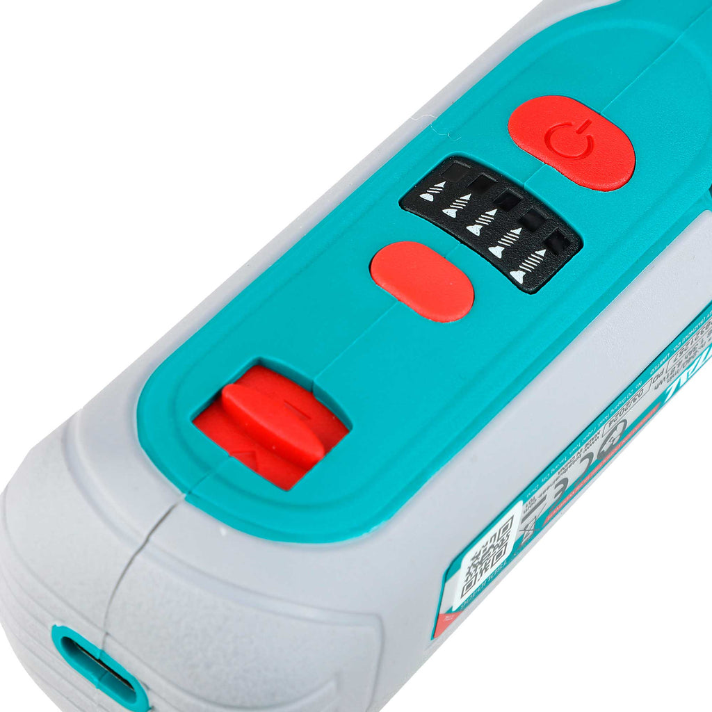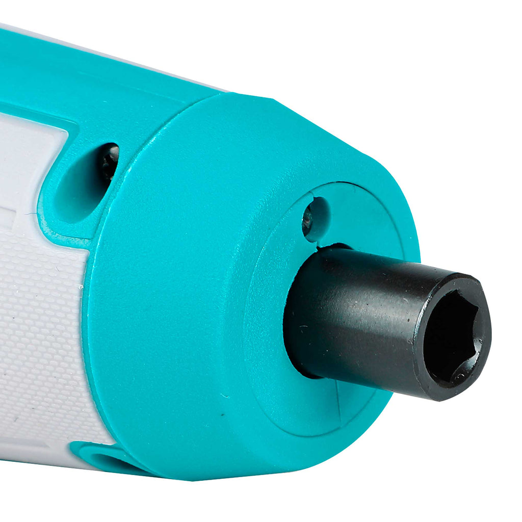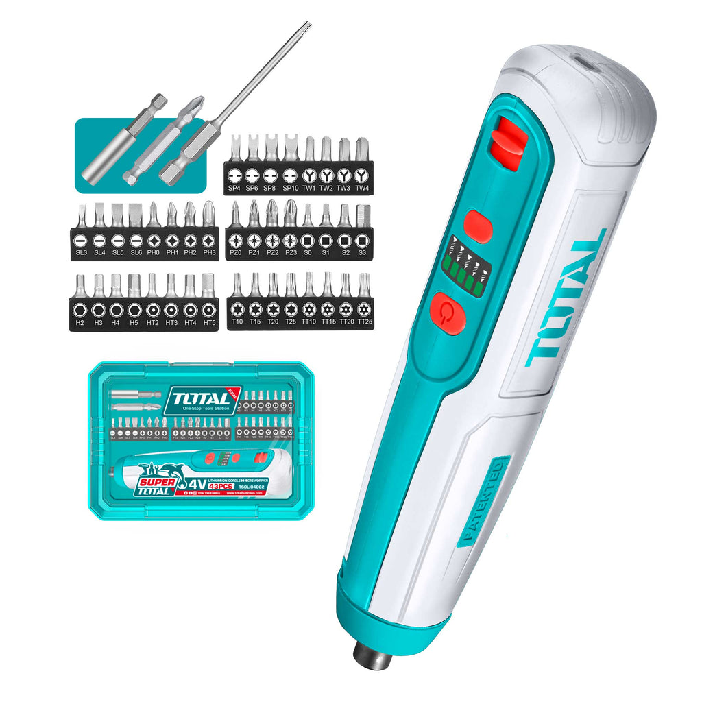 Napetost: 4V Šestrobni vpenjalni nastavek: 1/4″ Hitrost brez obremenitve: 240 vrt/min Največji navor: 5 N.m Integrirana delovna lučka Indikator nivoja napolnjenosti Polnjenje preko USB type-C kabla (kabel ni priložen) Vključuje: 40 kosov 25 mm Cr-V nastavkov + držalo 1 kos 50 mm Cr-V nastavek 1 kos 74 mm Cr-V nastavek 1 kos priključek Pakirano v plastični škatli