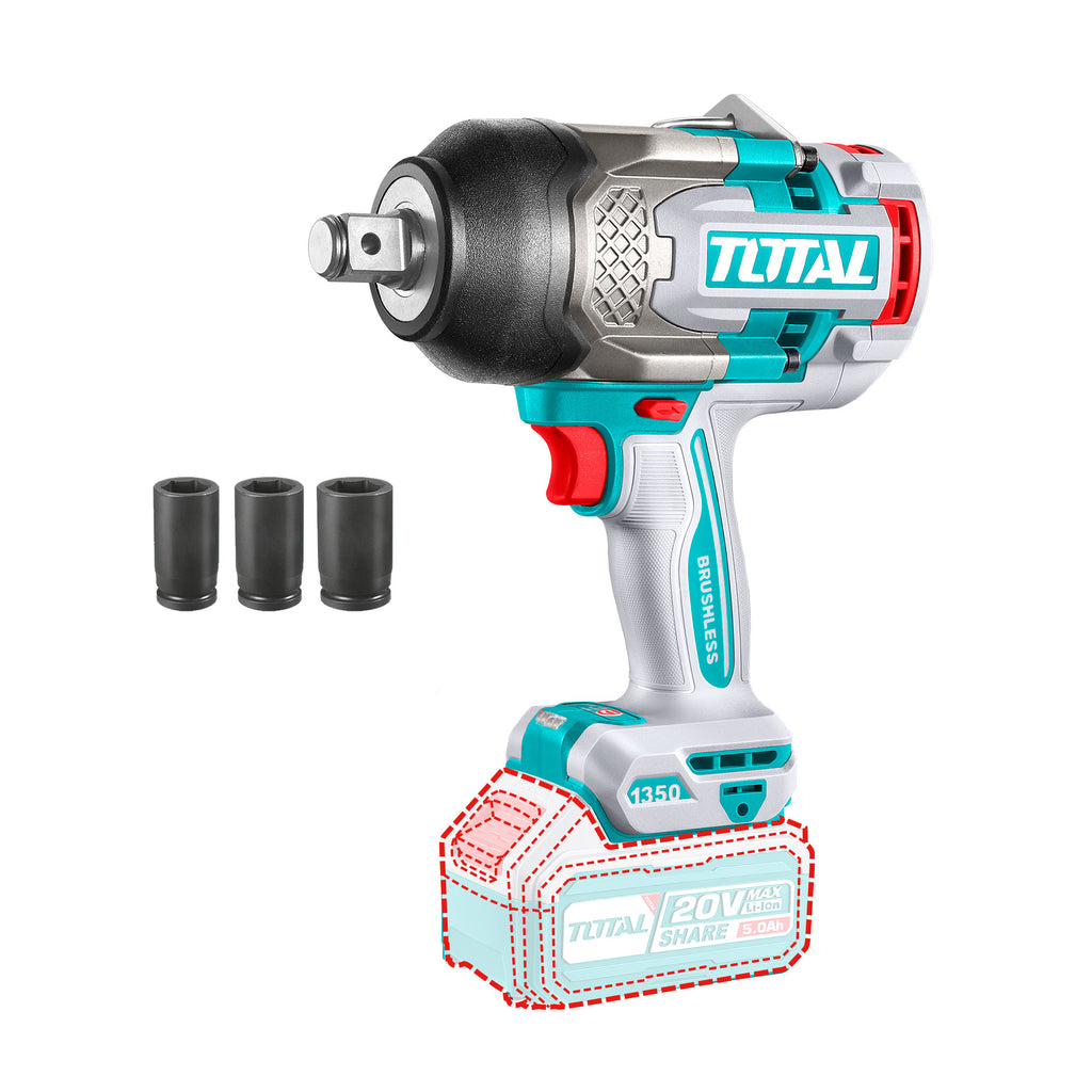 Brezkrtačni motor Napetost: 20V Kvadratni pogon: 3/4″ Hitrost brez obremenitve: 0-900/0-1200/0-1800 vrt/min Hitrost udarcev: 0-1800/0-2000/0-2200 ud/min Zatezni moment: 1350Nm Moment za odvijanje matic: 1900Nm Vgrajena delovna luč Vključuje: 3 kosi vtičnic (27 30 32mm) Vgrajena delovna luč Baterija in polnilec se prodajata ločeno Pakirano v barvni škatli
