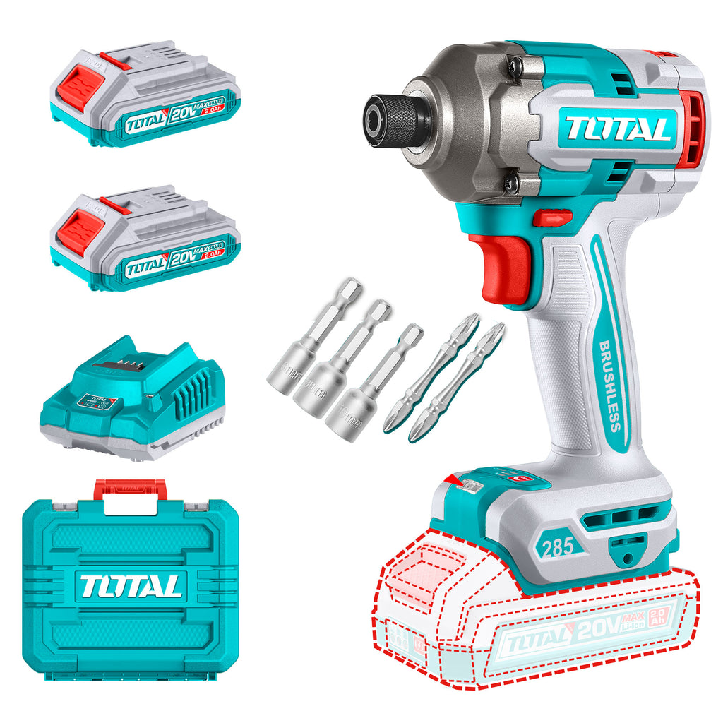 Brezkrtačni motor Napetost: 20V Šestrobni nastavek: 6,35 mm Hitrost brez obremenitve: 0-1600/0-1900/0-2600 vrt/min Hitrost udarcev: 0-2100/0-2500/0-2900 udarcev/min Največji navor: 285 Nm Vgrajena LED delovna lučka Vključuje: 2 kosa nastavkov za izvijač 3 kosi nastavkov za matice 2 kosa baterijskega paketa 2,0 Ah (TFBLI20011) 1 kos polnilnika (TFCLI2001) Napetost polnjenja: 220-240V~50/60Hz Pakirano v prenosnem kovčku