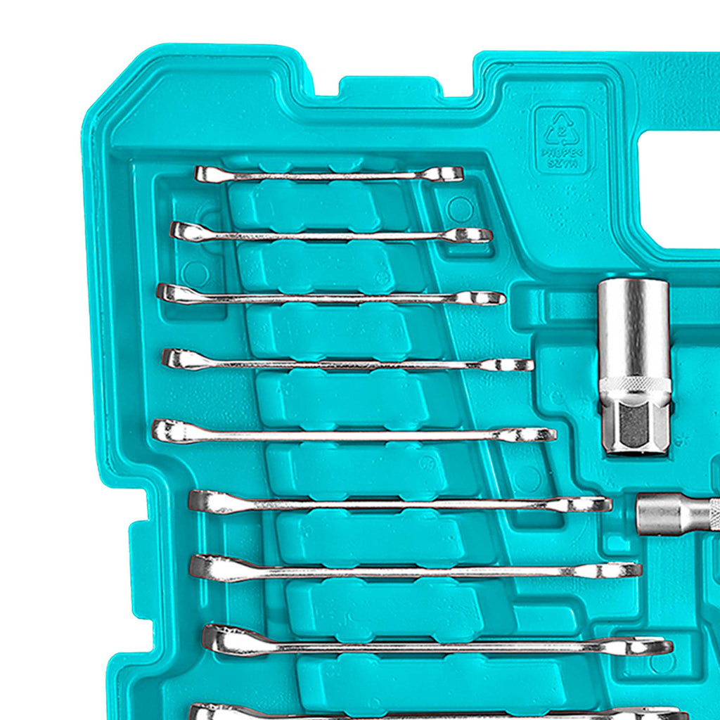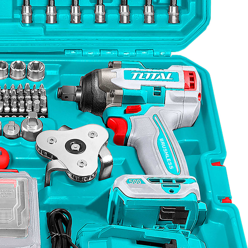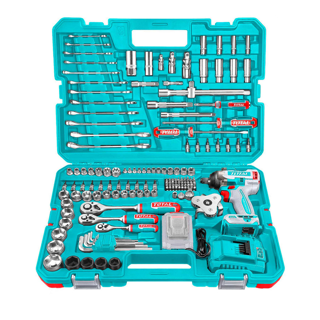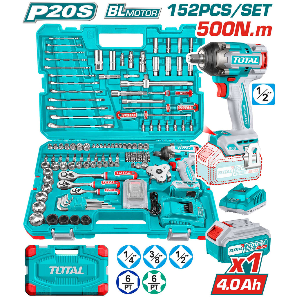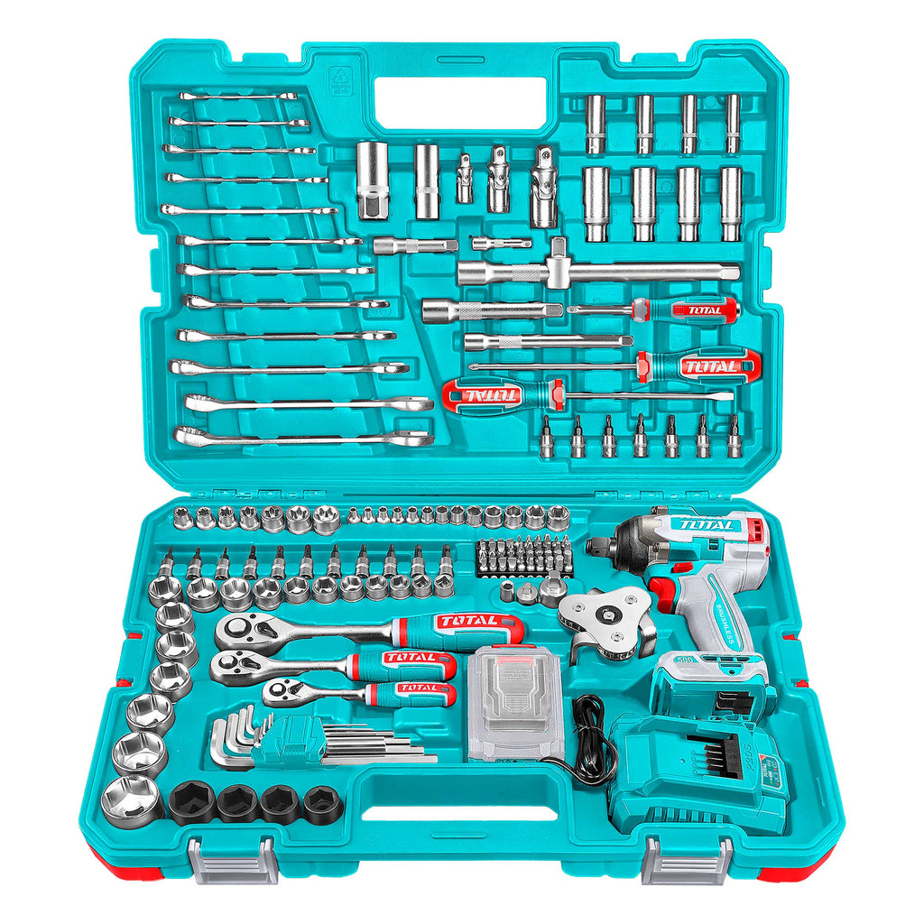 152-delni komplet brezžičnega udarnega ključa1 kos brezžični udarni ključ (TIWLI2050):Napetost: 20VKvadratni pogon: 1/2″Hitrost brez obremenitve: 0-1200/0-1800/0-2200rpmHitrost udarca: 0-2400/0-2800/0-3300bpmZatezni moment: 500NmMoment za odvijanje matic: 650NmVključuje:1 kos 4.0Ah 20V baterijski paket (TFBLI2002)1 kos polnilec (TFCLI2001E)Napetost polnjenja: 220-240V~50/60Hz1 kos 1/4″ raglja ključ13 kosov 1/4″ vtičnica: 4-4.5-5-5.5-6-7-8-9-10-11-12-13-1418 kosov 1/4″ x32(L) nastavki vtičnica: Šesterokotnik: 3-4-5-6-8mm; Zvezda: T8-T10-T15-T20-T25-T30-T40; SL: 5.5-6.5mm, PH2,PH3,PZ2,PZ34 kosi 1/4″DR 50mm(L) globoka vtičnica: 8,9,10,12mm1 kos podaljšek: 1/4″ Dr. x50mm1 kos vrtljiv ročaj: 1/4″ x150mm1 kos 1/4″ univerzalni zglob1 kos 1/4″ tristranski adapter: 3/8″(F)x1/4″(M)1 kos držalo za nastavke: 1/4″x6.35mm40 kosov 6.35x25mm(L) nastavki: T5-T6-T7-T8-T9-T10-T15-T20-T25-T30-PH1-PH2-PH2-PH3-PH4-PZ1-PZ2-PZ2-PZ3-PZ4-SL3-SL3-SL4-SL4-SL5-SL5.5-SL6-SL6.5-SL7-SL7-H2-H3-H3-H4-H4-H5-H5-H6-H7-H74 kosi udarna vtičnica: 17,19, 21,22mm1 kos raglja ključ: 1/2″1 kos 1/2″ univerzalni zglob7 kosov 1/2″ Dr. vtičnica: 21,22,23,24,27,30,32mm2 kosa vtičnica za svečke: 1/2″ Dr. 16mm-21mm2 kosa podaljšek: 1/2″ Dr. x125mm, 1/2″ Dr. x250mm1 kos 1/2″ tristranski adapter: 3/8″(F)x1/2(M)10 kosov 3/8″ šesterokotna vtičnica: 10,11,12,13,14,15,16,17,18,19mm4 kosi 3/8″ globoka šesterokotna vtičnica: 13,14,15,17mm7 kosov 3/8″ zvezdasta vtičnica: E10,E11,E12,E14,E16,E18,E201 kos raglja ključ: 3/8″2 kosa 3/8″ podaljšek: 75mm(3″),150mm(6″)1 kos Dr. univerzalni zglob: 3/8″1 kos 3/8″ tristranski adapter: 3/8″(F)x3/8(M)1 kos ključ za oljni filter2 kosa izvijača: SL6.5×150,PH2x15012 kosov kombinirani ključ: 6,8,9,10,11,12,13,14,15,17,18,199 kosov Torx ključ: T10,T15,T20,T25,T27,T30,T40,T45,T50Pakirano v prenosnem kovčku