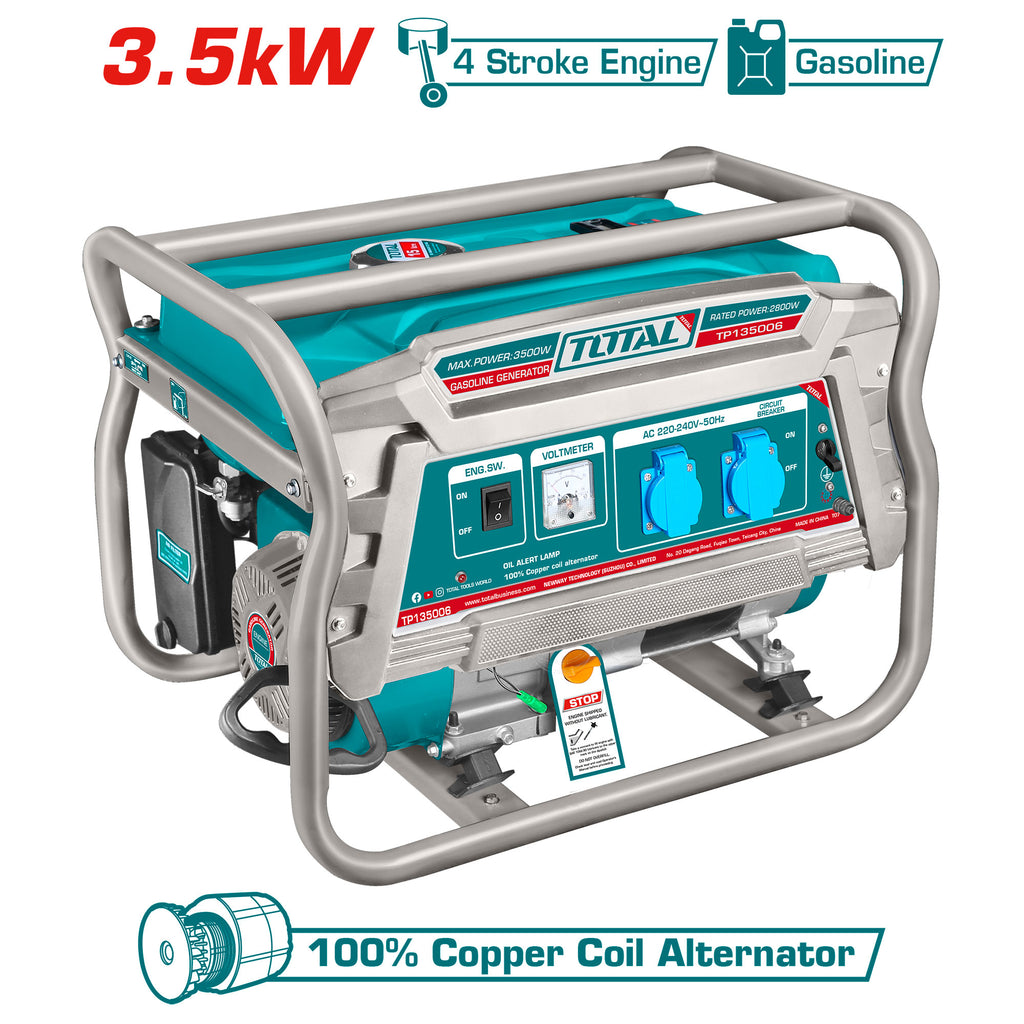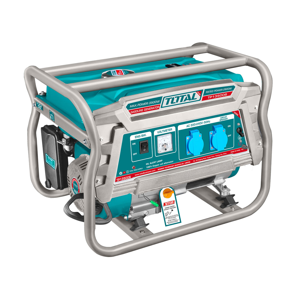 Nazivna napetost(V):220-240 Nazivna frekvenca(Hz):50 Maksimalna moč(kw):3.5 Nazivna moč(kw):2.8 Nazivna hitrost(vrt/min):3000 Motor:4-taktni, OHV Prostornina(mL):208 Hladilni sistem:Zračno hlajen Vžigalni sistem:T.C.I Zagonski sistem:Ročni zagon Alternator z bakreno tuljavo Rezervoar za gorivo(L):15 Suha teža(kg):42 Pakirano v kartonski škatli