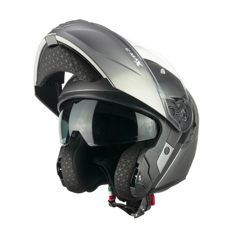 CGM C-MAX je nova potovalna čelada namenjen tistim, ki se vsak dan odpravijo iskat nove avanture. Kombinacija sloga in funkcionalnosti, ki nudita najboljše udobje in vrhunske zmogljivosti v vseh pogojih, od običajne mestne ceste do najbolj pustolovske poti. Čelada CGM C-MAX ima vizir odporen na praske, skrit notranji vizir za sonce in kompatibilna z lečami Pinlock 70. Sistem Air Stream s tremi notranjimi območji kanaliziranja omogoča prilagajanje pretoka zraka in ohranja čelado hladno tudi v najbolj vročih dneh. Predpriprava za namestitev bluetooth slušalke in mikrofona ter prilagojena notranja podloga, ki vam omogoča nemoteno uporabo korekcijskih očal. Dvojna homologacija omogoča vožnjo z modularno čelado v zaprti ali odprti konfiguraciji.