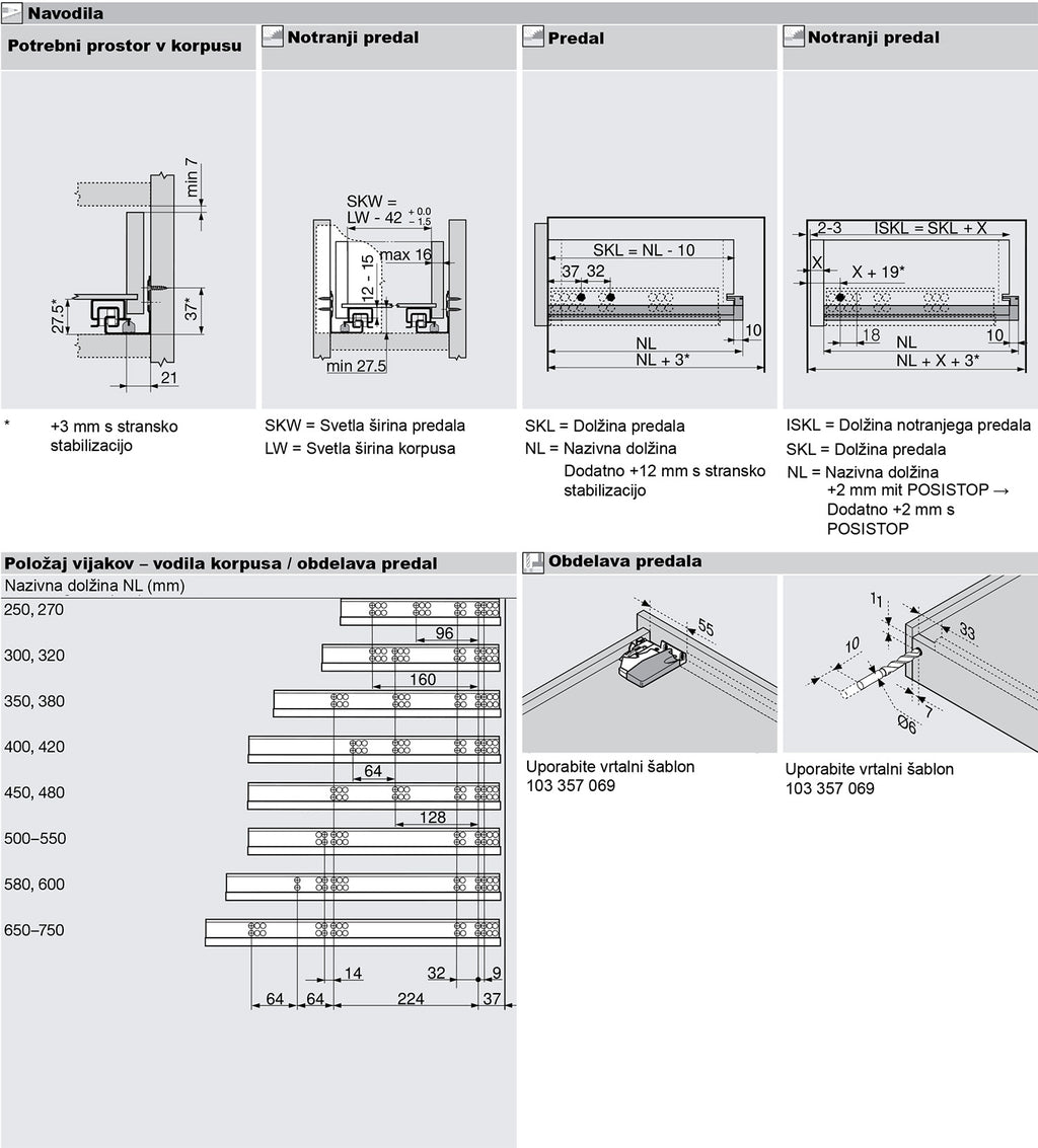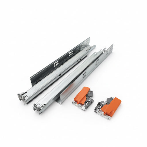 Blum Tandem BLUMOTION 560H je skriti vodilni sistem za lesene predale, ki ga zaradi svoje tehnologije in kakovosti pogosto imenujejo kar zlati standard v pohištveni industriji. Vodila so nameščena pod predalom, zato ostane videz pohištva čist in eleganten, hkrati pa sistem omogoča gladko drsenje in tiho zapiranje.